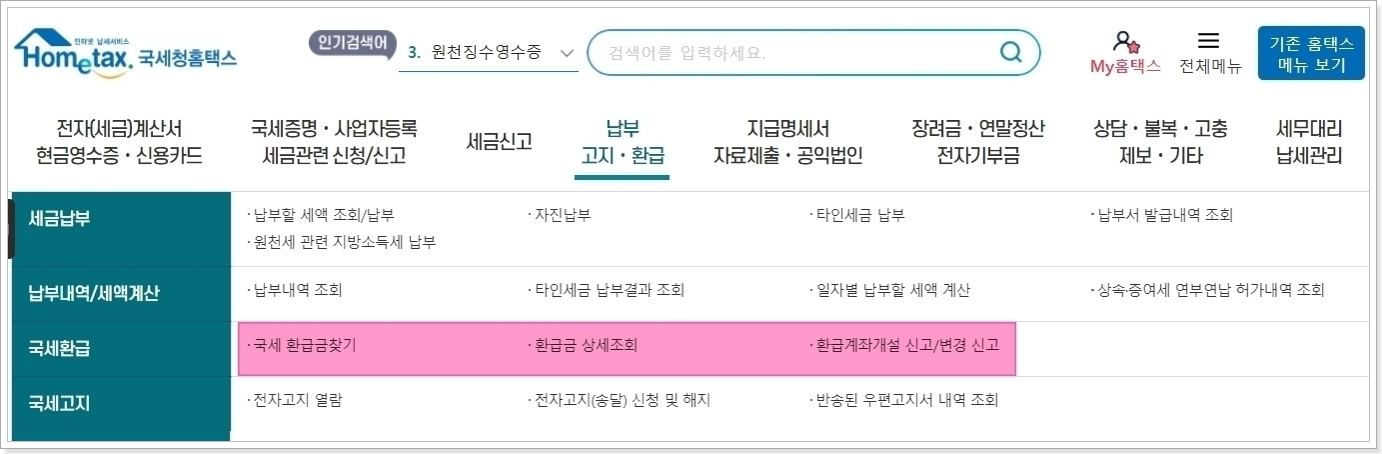 - 국세청 홈택스: 종합소득세 환급금, 국세 환급금 조회 가능